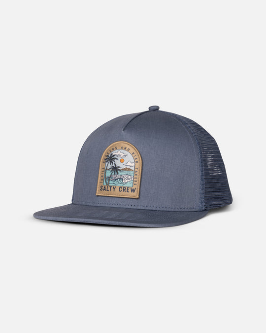 • The Salty Crew Archway Boys Trucker in Pilot Blue features a mesh back, flat brim, snapback closure, and a front patch with palm tree, ocean waves, sun, and "Salty Crew: Thrill Seekers and Risk Takers" text.