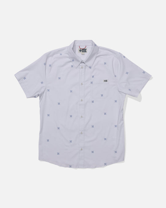 • The Salty Crew Drifter UV Button Up in Light Grey is a short-sleeve shirt shown from the back, featuring a subtle pattern of small blue X shapes and enhanced with quick-dry fabric for comfort.